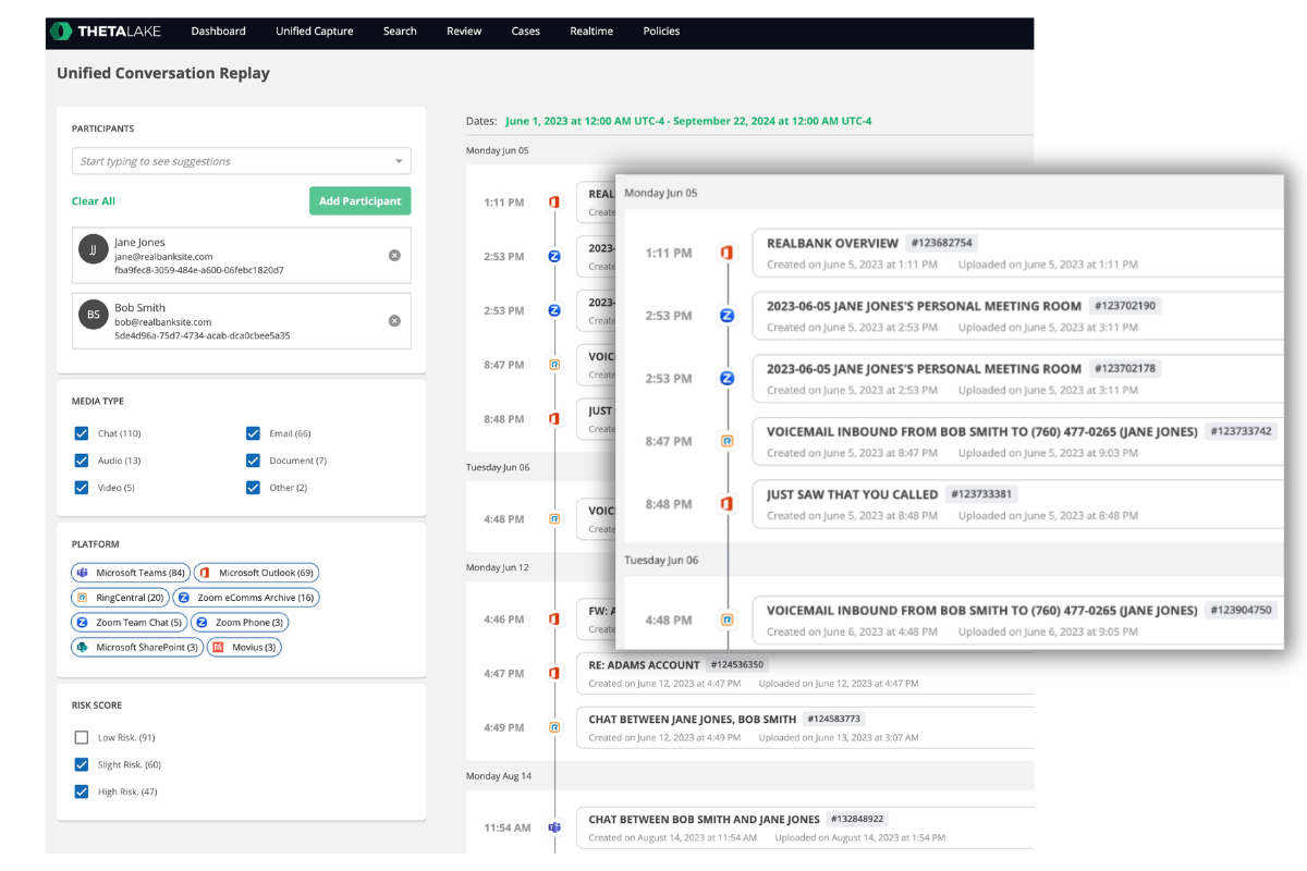 Theta Lake Capabilities: Theta Lake provides a unified conversation and timeline view across all channels, tools, and modalities of a conversation that may span multiple messages, emails, meetings, phone calls, and more. Those unified conversation replay and timeline views include highlights where detections hit as well as the option to use AI summaries of the conversation and its topics all to drive efficiency and timeliness in search and monitoring.